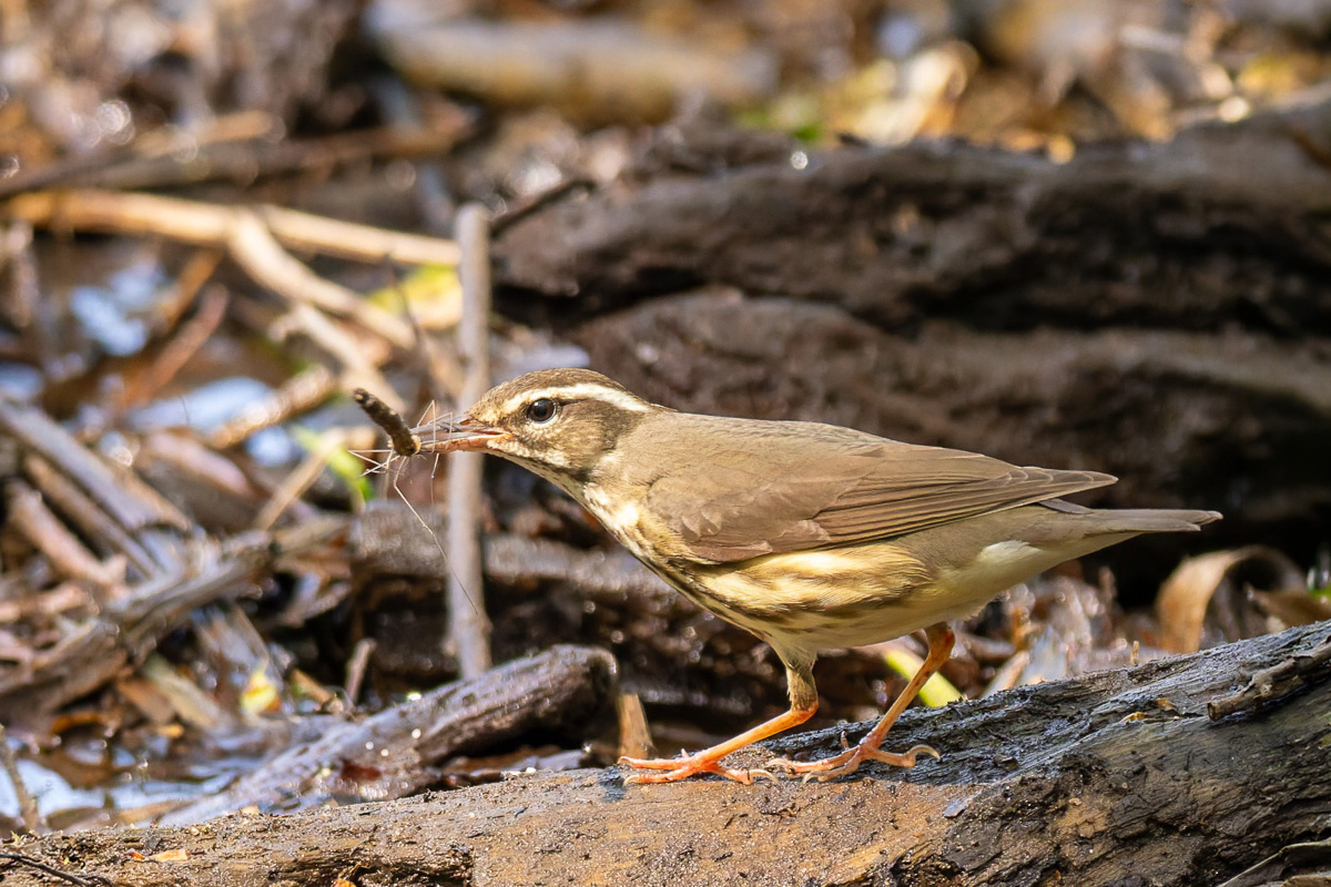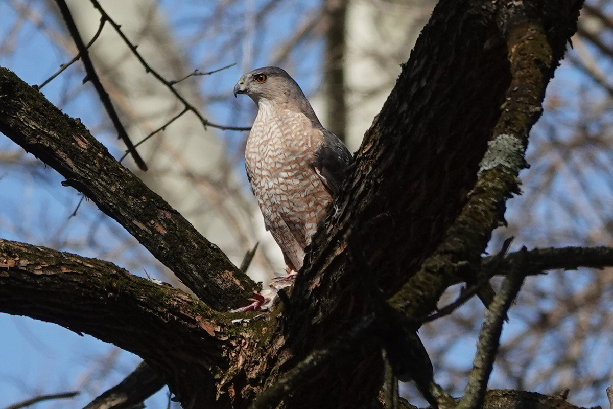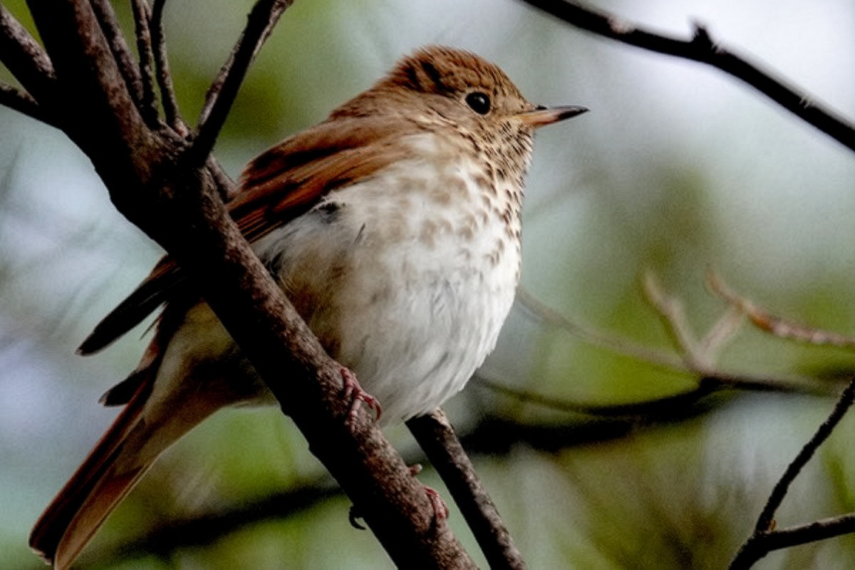 We continued to the Midwood and Ravine, lingering in this old-growth forest where Tom pointed out a Cooper’s Hawk nest. The female was on the nest while the male fed nearby. Soon, the female joined him; he passed her the prey, and they briefly copulated. Not far from there, Tom identified a territory where Acadian Flycatchers are known to nest later in the season. Singing Pine and Palm Warblers gave us a chance to compare their vocalizations, and Tom shared detailed insights into the calls and songs of these and other species we encountered.