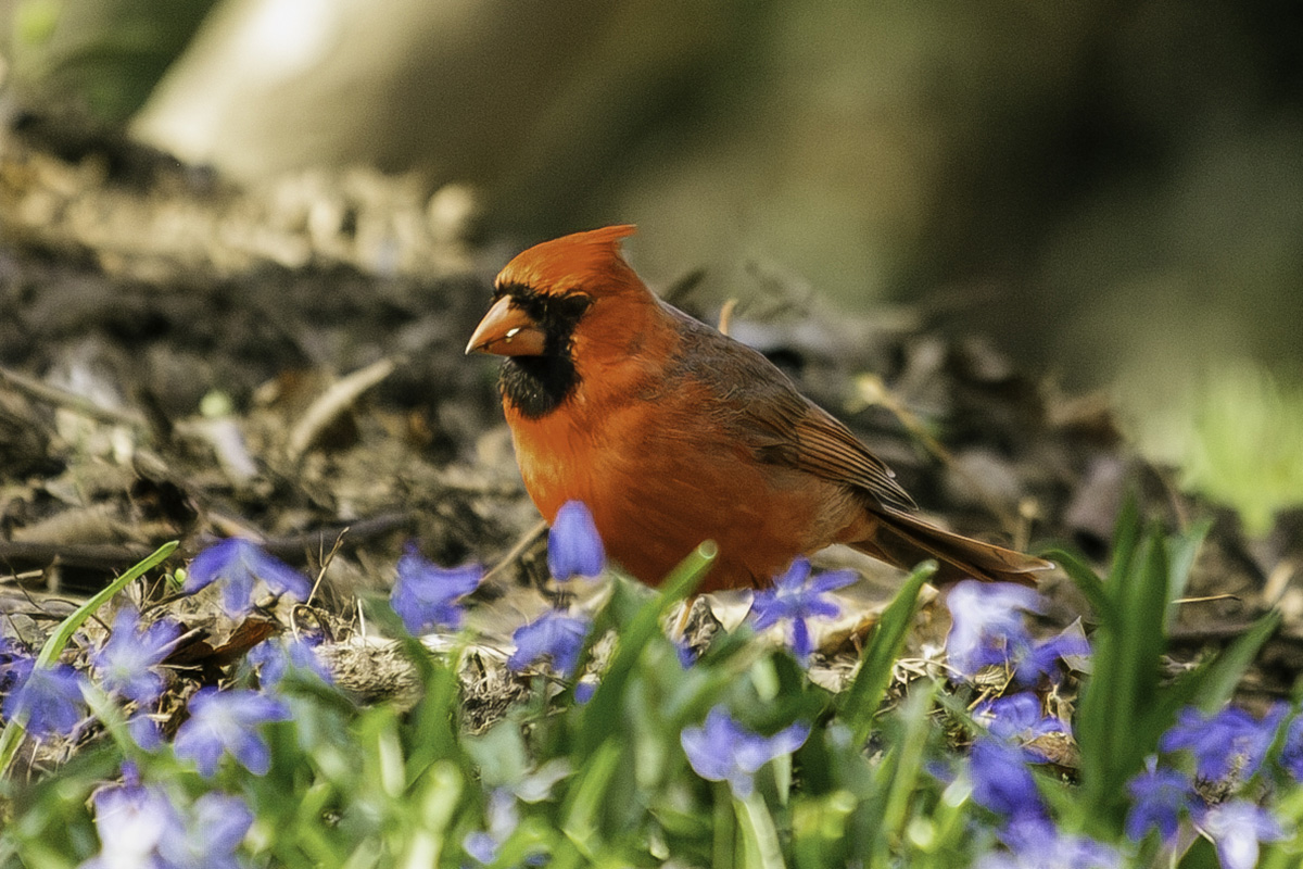 Our first photo opportunity upon entering the park was a Northern Cardinal posed on the ground among Siberian squill (Scilla siberica). We bypassed the Vale of Cashmere—normally an excellent spot for early migrating warblers—as it is currently under reconstruction (or “destruction,” as Tom put it). He has been actively advocating for preserving natural wildlife features and soft edges in the redesign.