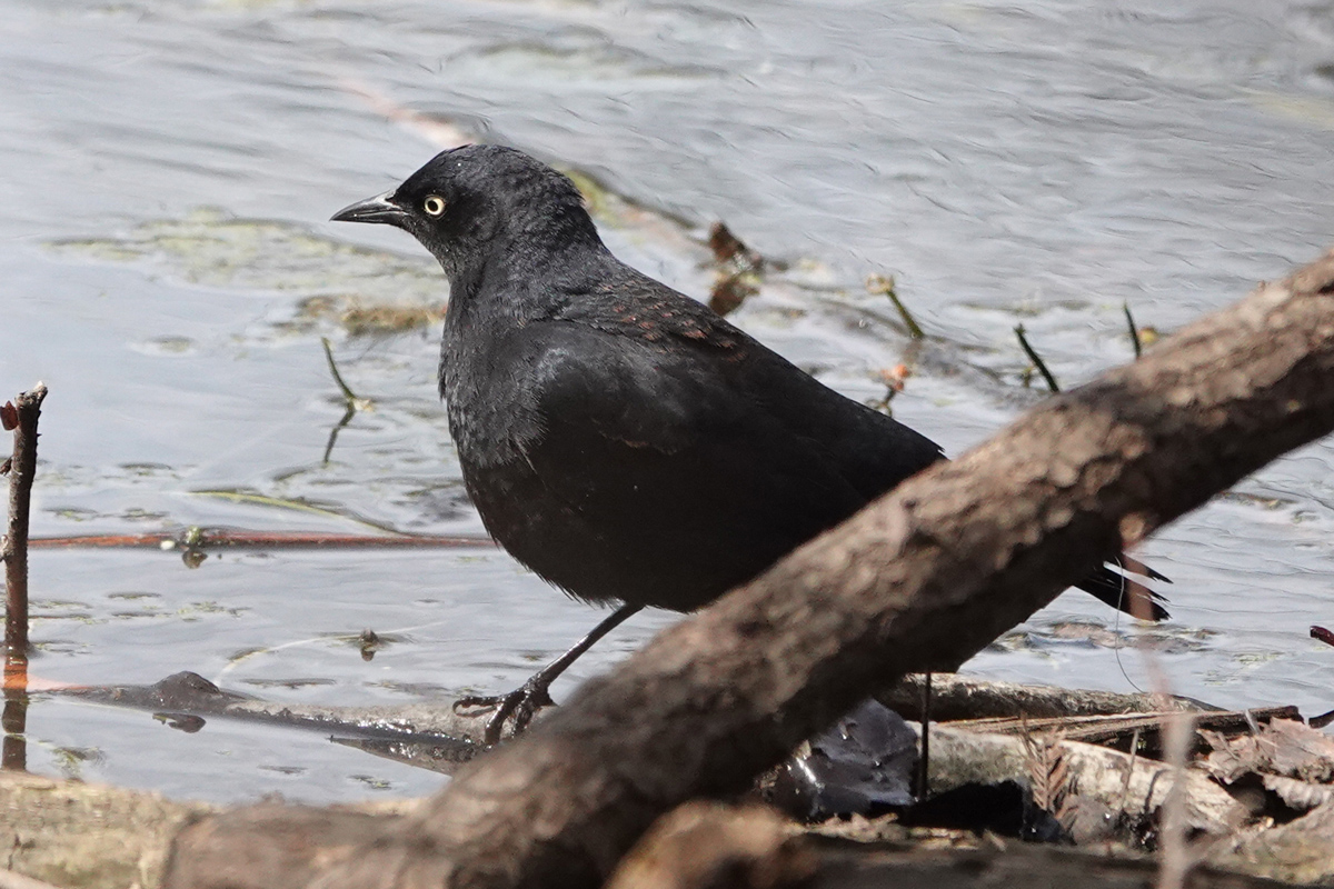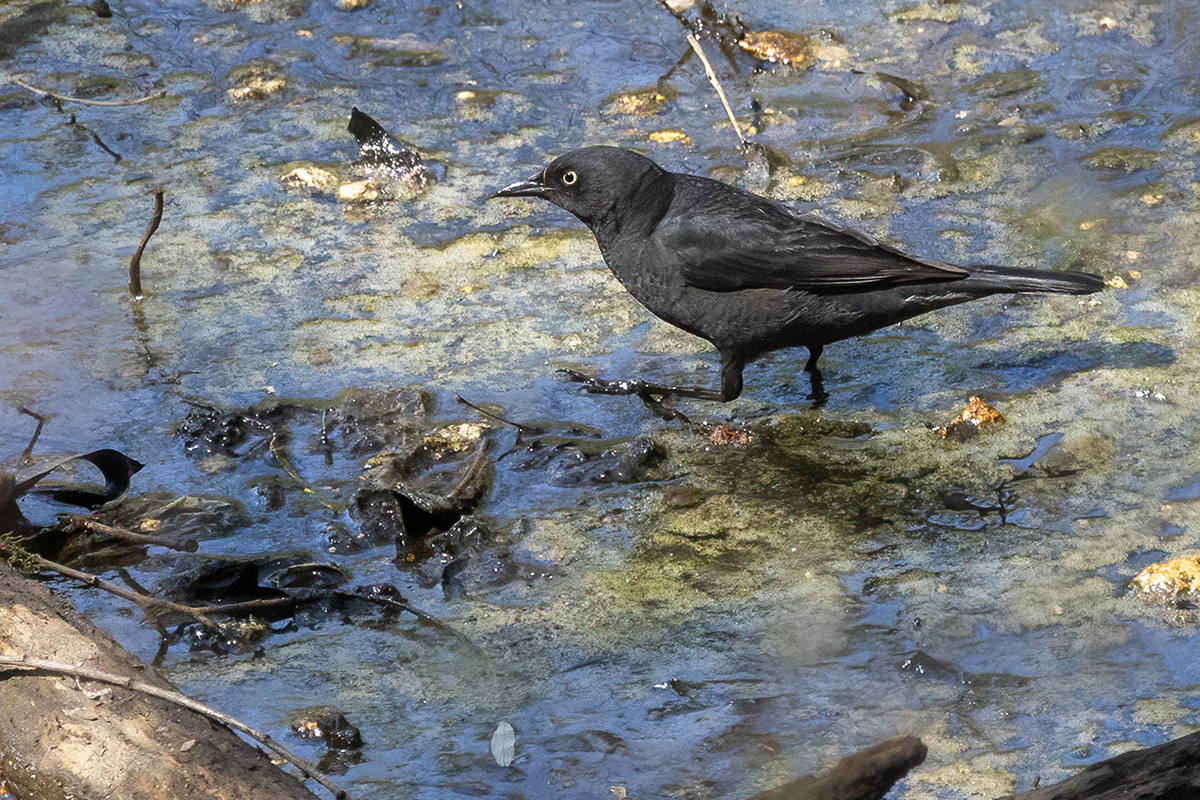 We eventually made our way to the Lake, circling the Peninsula and continuing along the paths through the Lullwater, where we observed many warblers. Our final species was a Rusty Blackbird sifting through leaf litter near the boathouse. It offered a good opportunity to see the species in spring plumage. As Tom pointed out the fall coloration wears off by the spring. It also presented a photographic challenge: a dark bird against a dark, unflattering background with limited shooting angles.