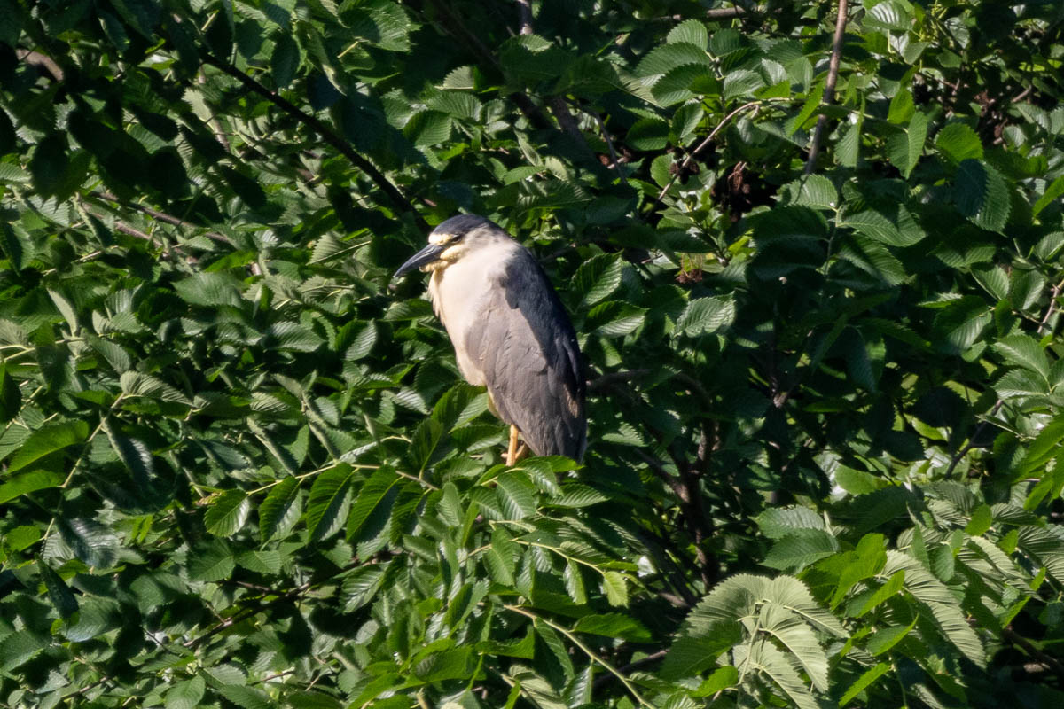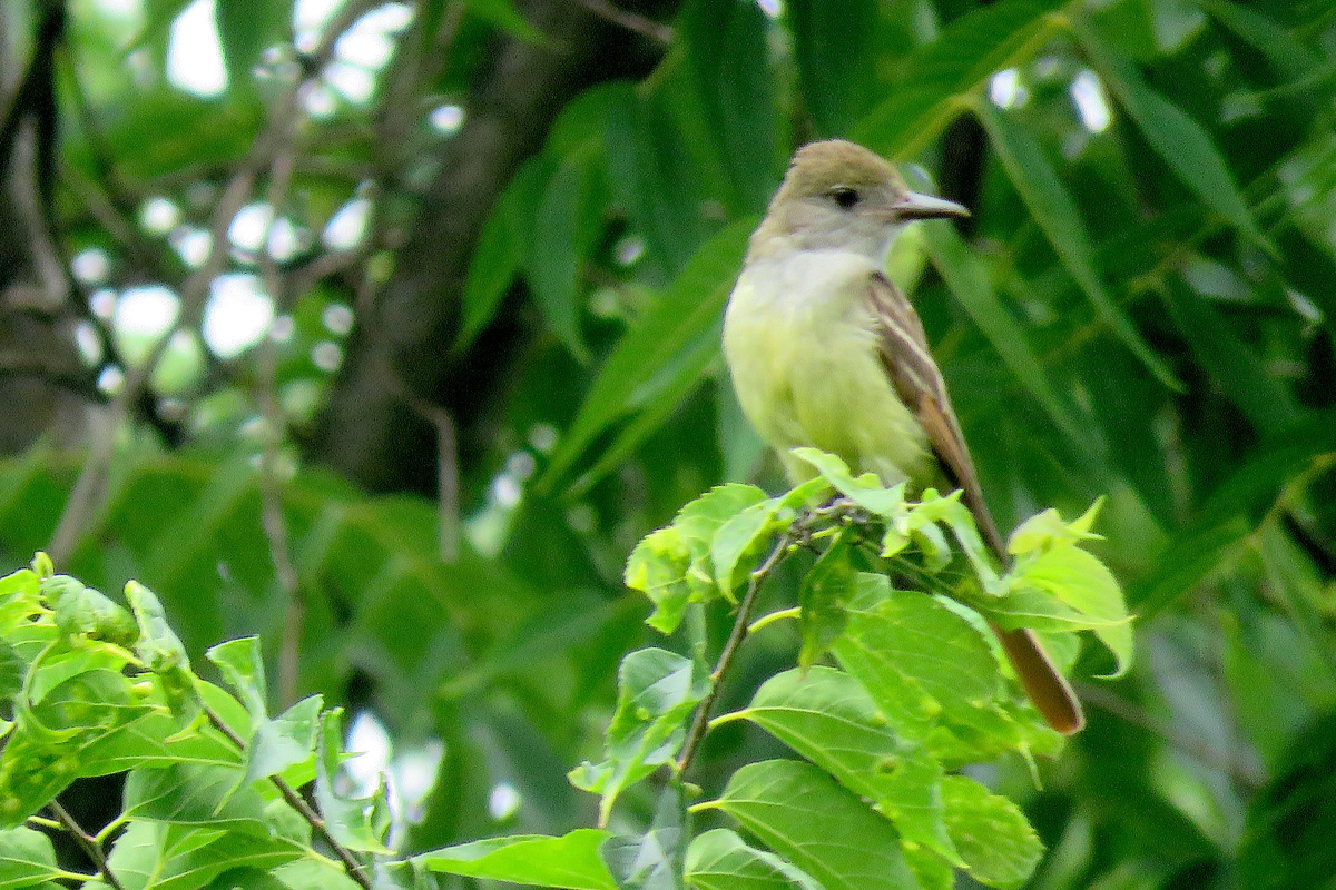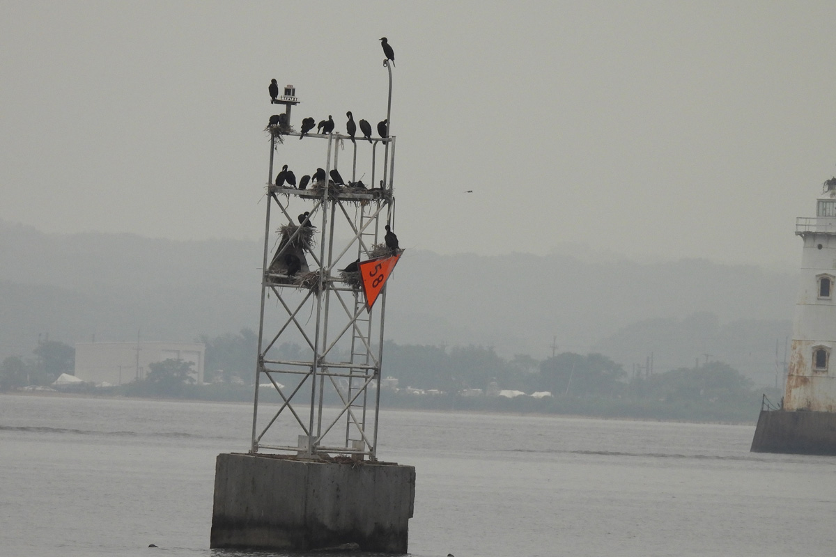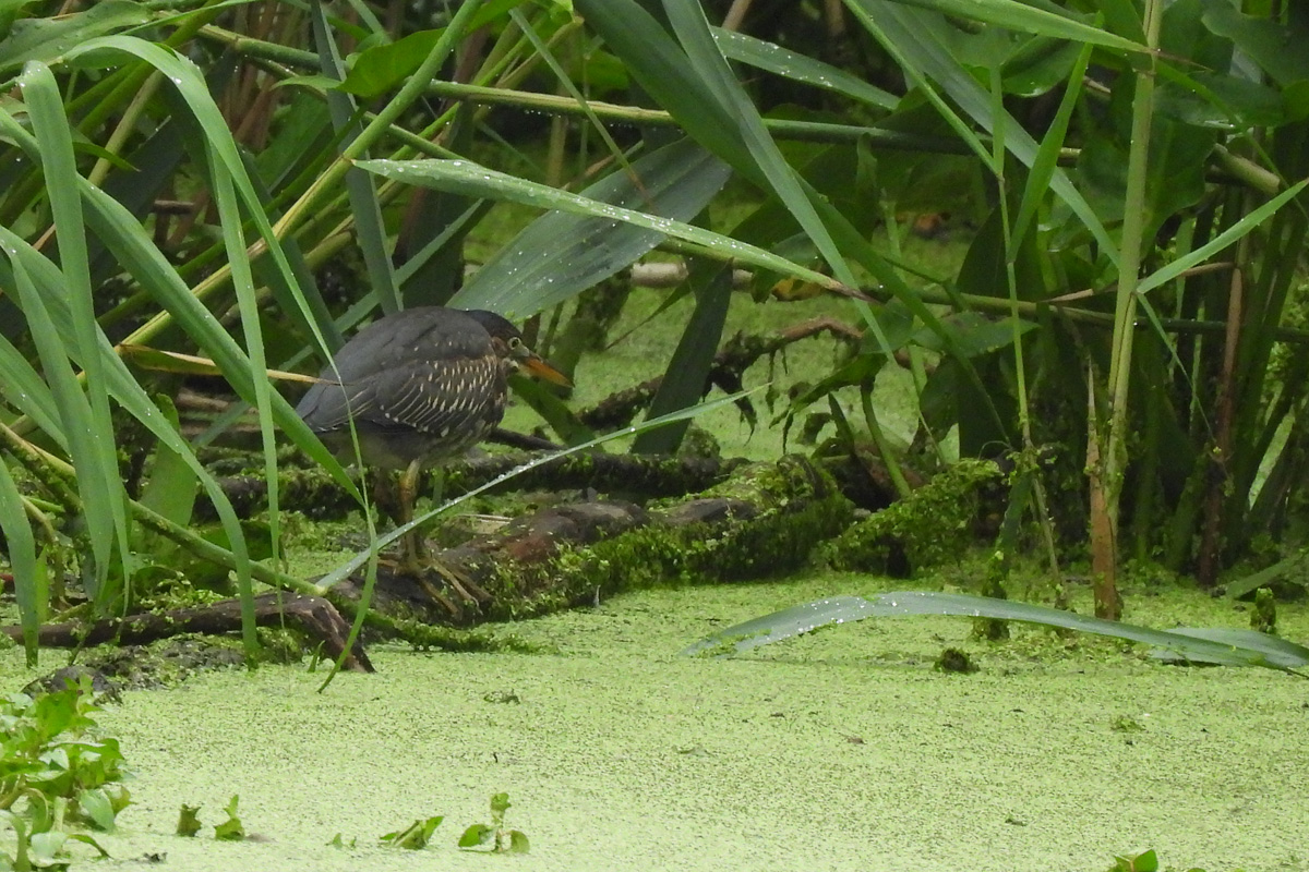 The focus of our walk was nesting birds, and we started at Conference House Park to find them. Beginning along a lush, wooded path, we soon saw evidence of recently fledged birds. Our first sighting was a Gray Catbird in juvenile plumage, followed by robins with spotted breasts, a young Baltimore Oriole, and a White eyed Vireo trio moving in the upper reaches of nearby trees. We kept a lookout for nests, and saw some empty ones ā a possible Cooperās Hawk nest in good condition, a distant Bald Eagle nest, some dilapidated nests of unknown species, and one that was occupied by an alert robin looking back at us. After exiting the woods, we headed to the beach near the southernmost tip of Staten Island (and of New York State, as a sign nearby proclaimed). Beyond, in the bay, a colony of nesting Double-breasted Cormorants was occupying a channel marker, and further out, at the top of a lighthouse, an adult Osprey perched on its nest. Back on the beach there were Canada Geese with goslings and large numbers of starlings; and flying over the water, close in, were Common Terns, and many gulls. Leaving the beach, we entered a meadow where we heard and saw the first Indigo Bunting of what would become several for the day, and in a wetland area, we discovered two well camouflaged Green Herons.