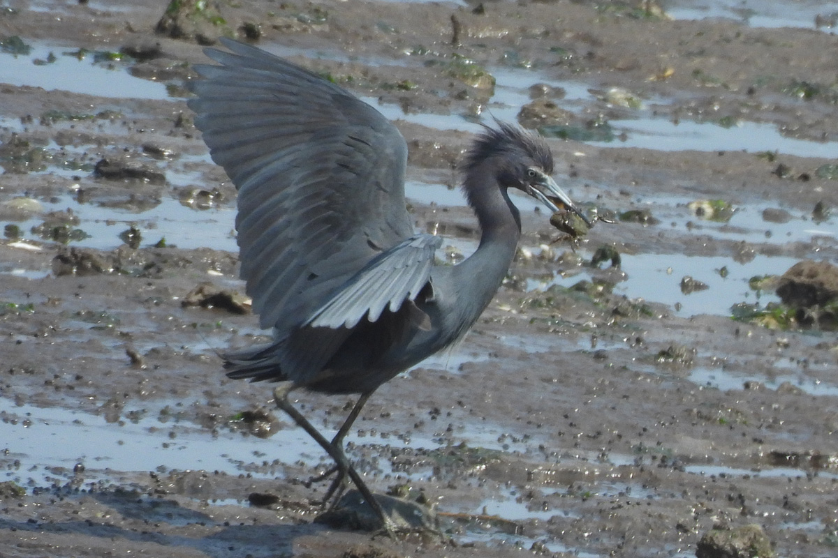 Our final destination was Great Kills Park to see the Bank Swallows and their nests, and, possibly, the reported, rare-for-the-season Black Scoter. We didnāt find the Black Scoter, but we had a nice surprise seeing a Little Blue Heron on the mud flats, holding its own against a harassing Great Black-backed Gull. And sharing the mudflats with the Little Blue Heron were a pair of American Oystercatchers, a Snowy Egret, a Boat-tailed Grackle, and along the grassy edge ā and easy to miss ā a Yellow-crowned Night Heron. And all the while, the Bank Swallows were swooping and flying in front of us and along the sand bank below.