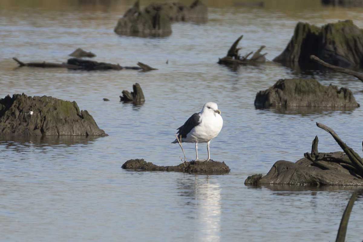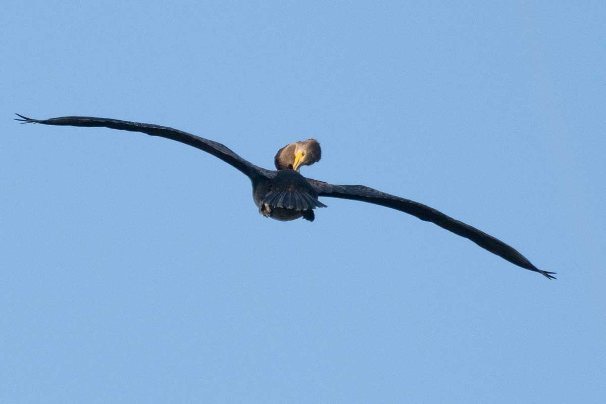 As the habitat changed from trees to scrub, with lichen coating the ground, we heard a Hermit Thrushās call and spotted more Eastern Phoebes as well as Yellow-rumped Warblers and Kinglets. We also, much to our dismay, encountered sand burrs (quite painful and difficult to remove)! After removing the burrs, we got back into our cars and returned to our beginning meeting point. By this time, the tide had swallowed the sandbar and the American Oystercatchers had disappeared, but we still spotted many birds swooping and diving and grabbing a quick snack of fish on the fly. Among the swooping mass of over one hundred Forsterās Terns was a lone Common Tern. On the grass near the pier, a Ring-billed Gull inspected us as it stood in the sun and on the pier were two hundred or so Double-crested Cormorants flying in, sunbathing, resting, and preening. Farther out, near a green buoy with a Double crested Cormorant perched atop it, a male Northern Pintail decoy bobbed up and down in the waves.