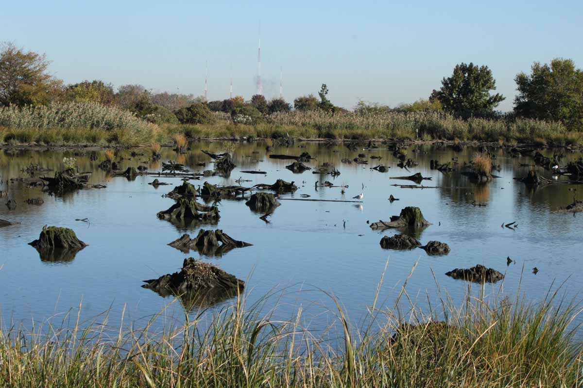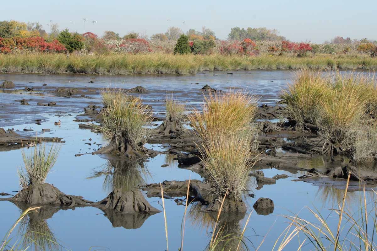 Mill Creek Marsh is a remediated wetlands habitat in the New Jersey Meadowlands that long ago was a freshwater swamp with stands of Atlantic white cedar. Today it is a brackish marsh, with vestiges of the Atlantic white cedar seen as stumps, particularly at low tide; a mixture of water pools and mud flats; and native vegetation growing in a landscape once dominated by phragmites. It is a prime birding location year-round with 228 species on the eBird Field Checklist.