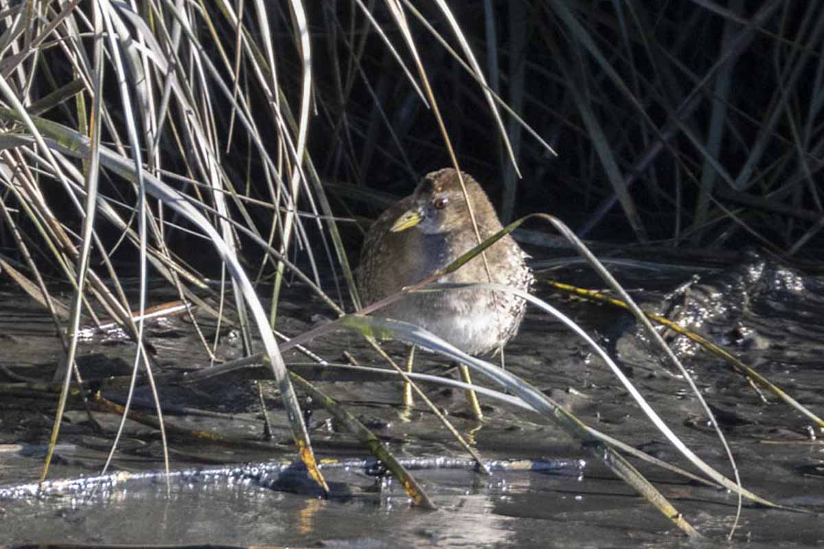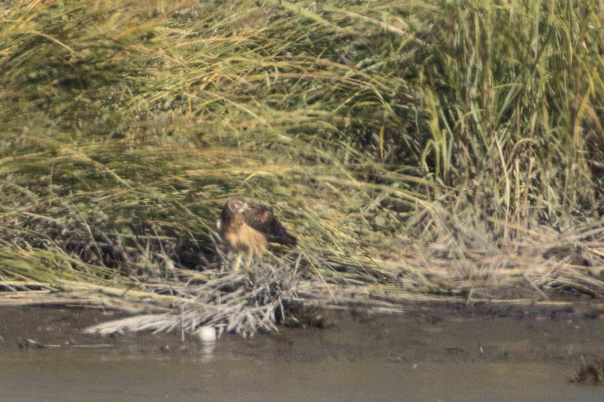 The Mill Creek Marsh Trail passes through mud flats, impoundments, marshy areas and uplands. Among the highlights during our walk were a Sora that had emerged from the grasses and for an appreciable time stood along the waterās edge; a Northern Harrier that landed, and then perched facing us on the far shore of the North Tidal Pool, showing its facial disc and brown chest plumage; a late-in-the-season Indigo Bunting moving low in the underbrush and between the trees shading the path, amid the sounds of the NJ Turnpike; and an unexpected large group of Tree Sparrows actively feeding over the water.