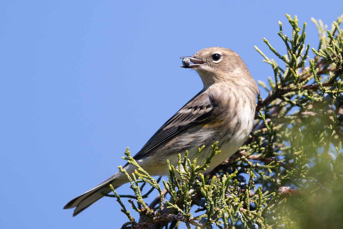 We then returned to our cars to bird a nearby location; a quick drive brought us to the other side of Jones Beach and the open Atlantic Ocean where we heard the sharp check calls of Yellow-rumped Warblers in the grass, and with Timās help spotted a Merlin on a pine tree in the distance. The Merlin appeared to be eating something, although at first we could not tell who or what. Then, the Merlin raised its prey, and we spotted the golden stripe on the head of a Golden-crowned Kinglet (nature is beautiful but painful to watch sometimes).