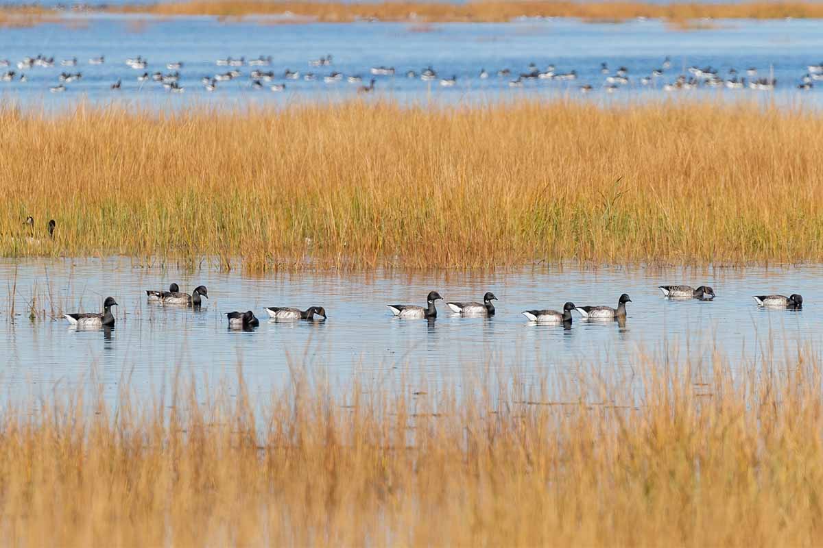 The group met at 9 am at the parking lot of the National Wildlife Refuge and proceeded to the trail along the West Pond that begins at the Visitor Center. Although the morning started out very chilly and windy, we were rewarded by seeing a huge blizzard of migrating Brants, both in the bay and on the pond as well as flying overhead. Many of us speculated as to the numbers, with estimates reaching well over ten thousand.Ā