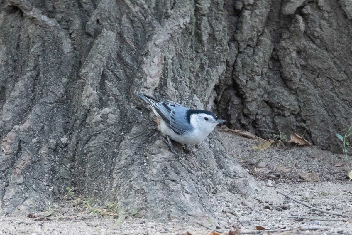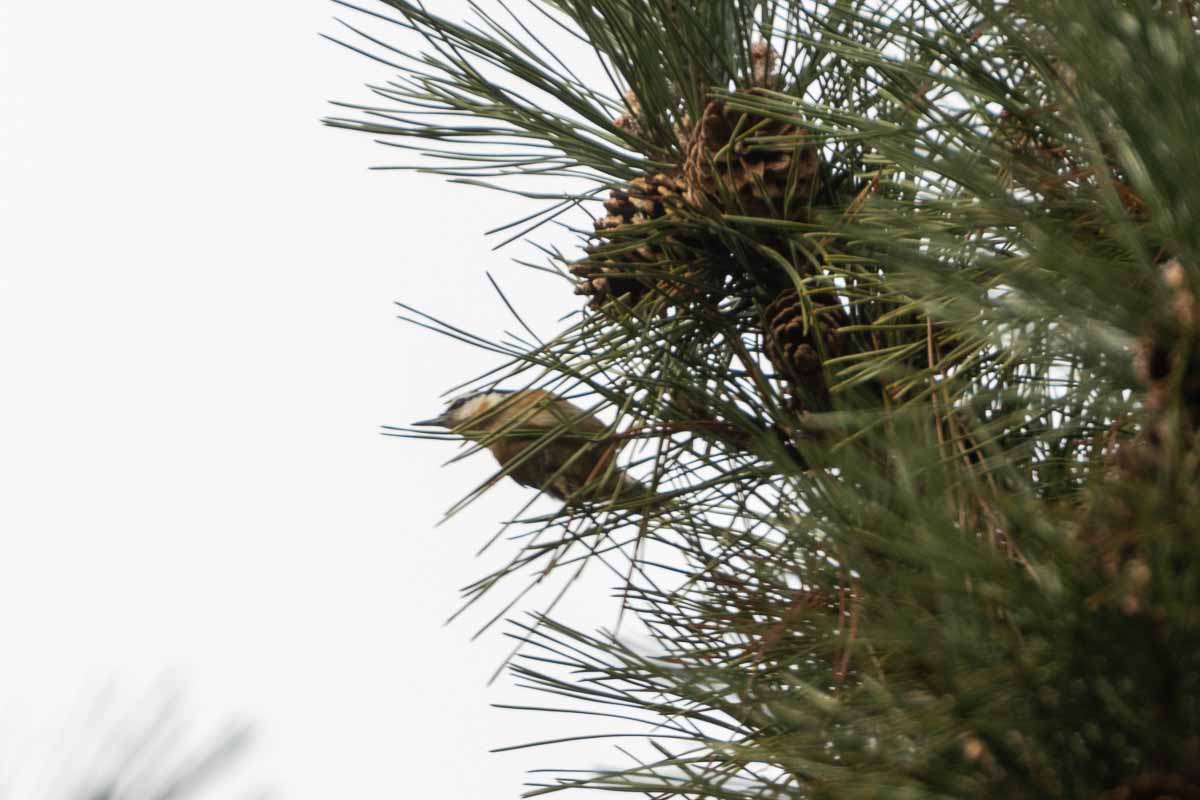 After that exciting encounter, we journeyed to a pine forest where we encountered a Red-breasted Nuthatch calling in the trees as others answered it’s calls; it then emerged and landed atop a dried-out pine tree, where it feasted on a plentiful bounty of cones. In a different pine tree, we noticed movement ā a Golden-crowned Kinglet hopping about searching for its next meal of insects (these little birds eat three times their body weight each day!). We moved on to where low-lying shrubs were mixed in with grasses and short, stubby trees interspersed with sand and spotted Dark-eyed Juncos dancing about, along with White-throated and Song Sparrows. Looking up, we observed Wood Ducks flying over and heard the pipit call of American Pipits.