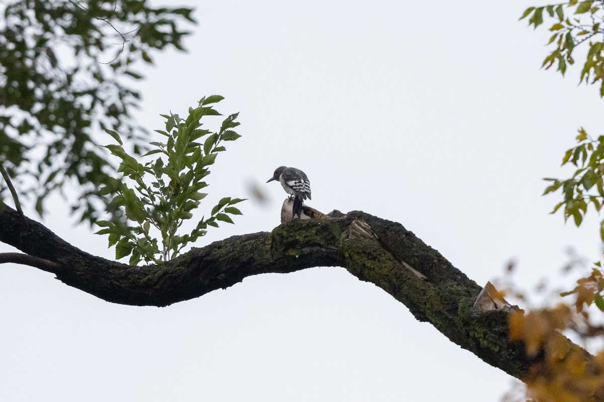 Thirty-three participants gathered on a cloudy damp morning. With the threat of rain from overnight mostly gone, the day was mild and the sun seemed to want to break through as the morning progressed. This late fall walk took us to different parts of the Park than earlier in the season, starting at the Pinetum, where our two groups eventually found the continuing Redheaded Woodpecker after a thorough search by all 66 eyes. It was also interesting to observe first-of-the-winter arrivals of American Coot, Northern Shoveler, Hooded Merganser, and Ruddy Duck on the reservoir, with a Green-winged Teal on the Pond as a bonus.