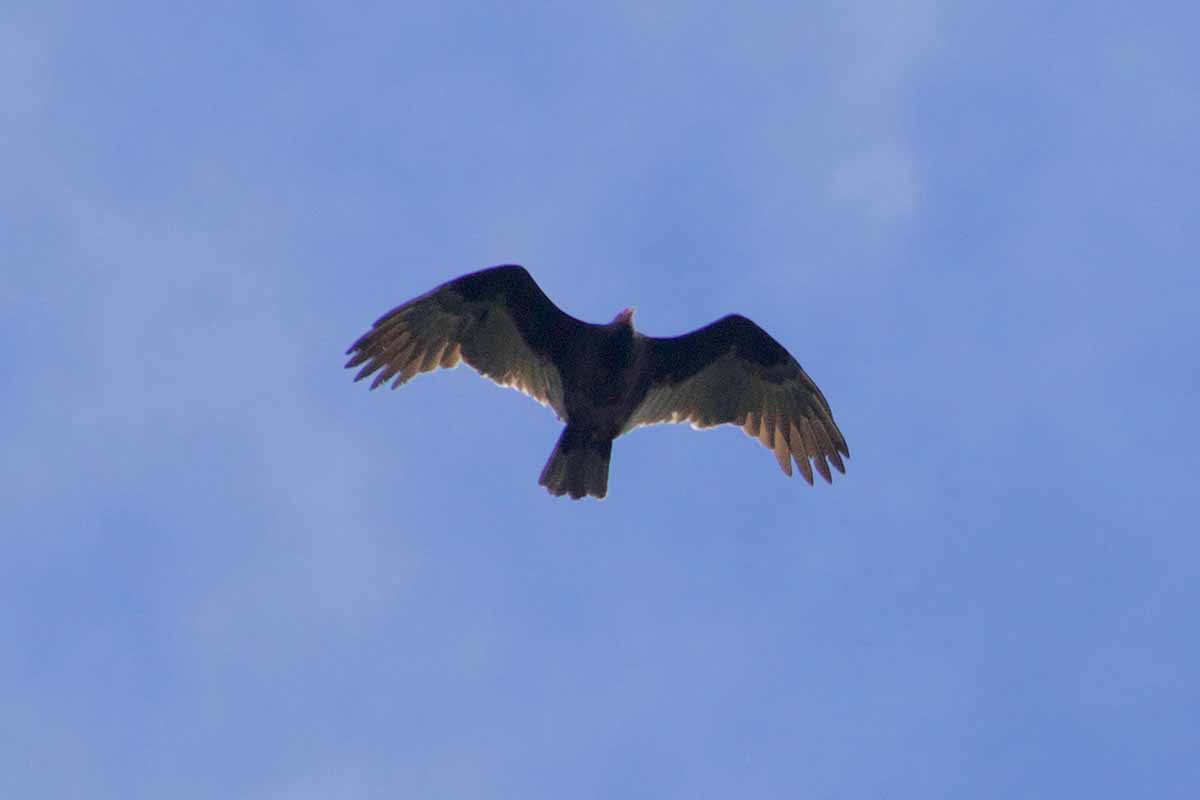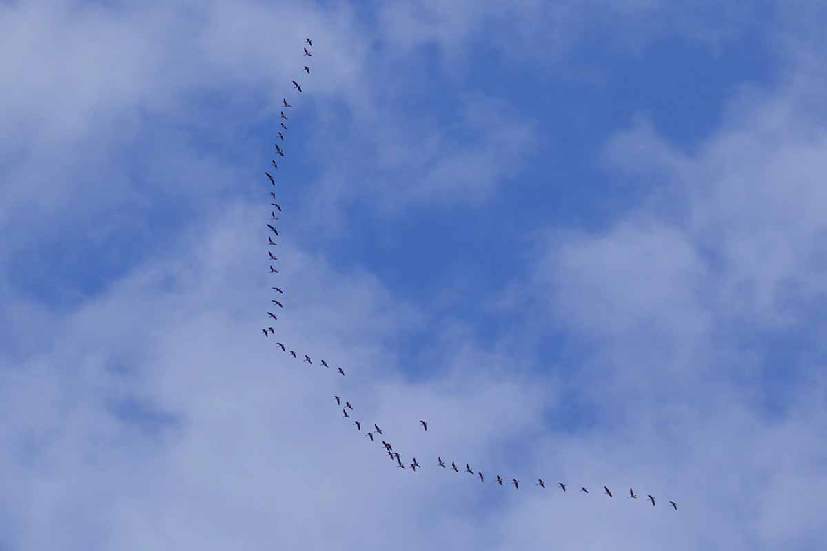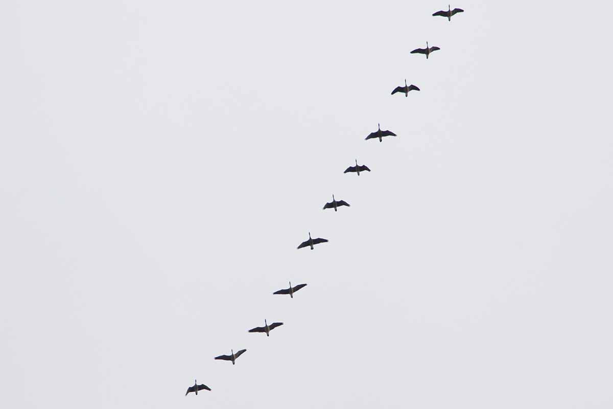 It was a cool, windy day, with good prospects for raptor migration, and as soon as we arrived, we began to see activity. Skeins of various sizes kept appearing, as Canada geese, Brant, and Double-crested Cormorants wove decorations in the clouds above. Some formed linear or semi-circular patterns, others partial triangles. We could see the birds alternating their positions in the flock. Turkey Vultures formed random-shaped kettles, floating through the clouds.