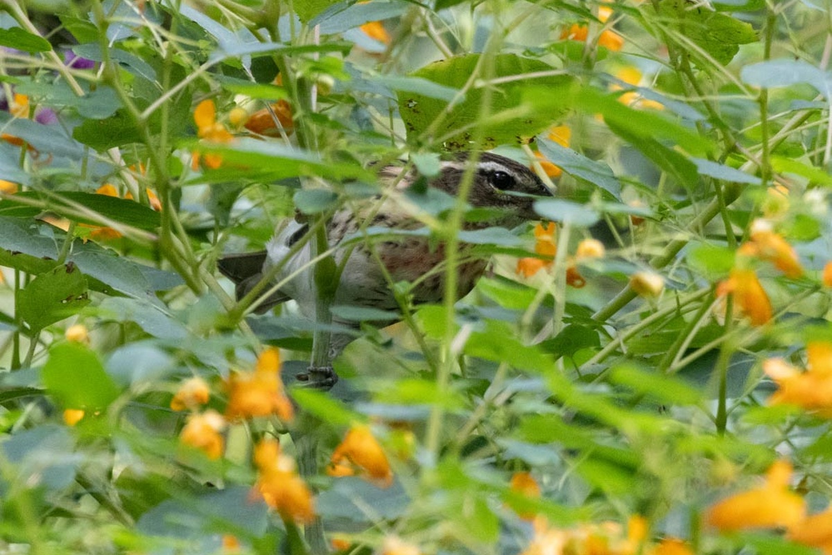 Twice each year, The Linnaean Society holds walks in memory of Starr Saphir, a local birding legend, who led walks in Central Park since the ‘70s. We started the day by talking about Starr and her approach to birding. One member of our group had birded with Starr, and two others were familiar with her from watching Jeff Kimball’s documentary Birders: The Central Park Effect, in which Starr appears. Inspired by Starr, we headed off into Strawberry Fields to begin our walk through The Ramble and nearby areas. Almost immediately, we began to see a variety of warblers, including Bay-breasted, Northern Parula, Common Yellowthroat, and American Redstart. We also saw Red-eyed Vireos, a Hermit Thrush, and various other birds. While on the Oak Bridge, one sharp-eyed birder spotted a Chestnut-sided Warbler, and we all got good looks at the bird. Our visit to The Point helped increase our warbler total for the day– thirteen in all. Other highlights included finding several hummingbirds in the jewelweed in Tupelo Meadow, seeing a Red-tailed Hawk diving at high speed in search of its prey and another perched low on a tree branch, and observing an American Kestrel in an aerial battle with another bird.