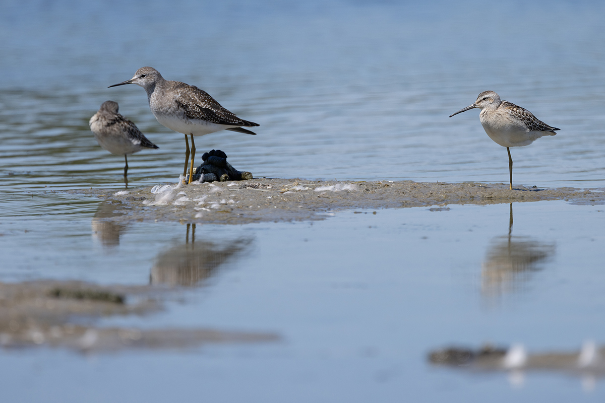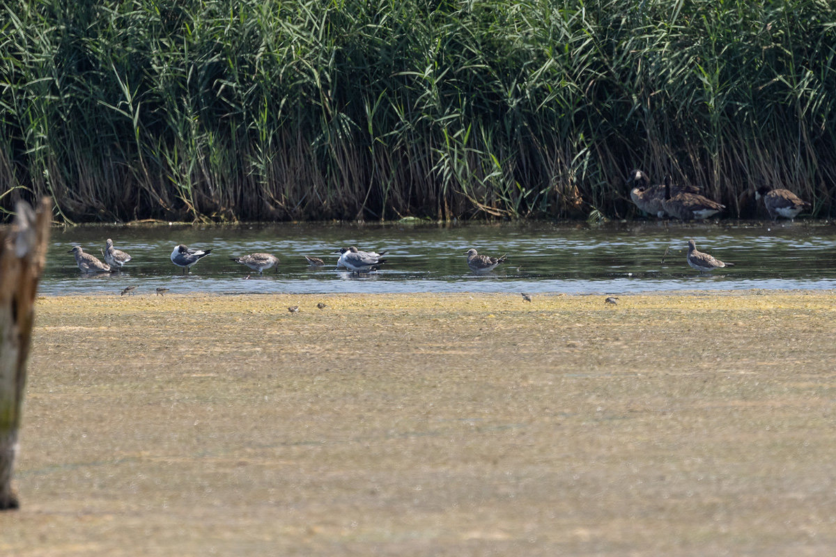 On an unseasonably lovely August Saturday, our group gathered early at the JBWR Visitor Center, and after an introduction by Tom, headed to the West Pond. Along the way, we saw a significant number of Tree Swallows swooping above the path, along with a variety of other species in the trees, and then a Ruby-throated Hummingbird buzzing about the bushes. Upon reaching the cutouts, the group spent almost 90 minutes observing the non-stop activity on the West Pond: on the spits of mud, out on the water, in the air ,and on the far shore. With sharp eyes and scopes, a few unexpected species included a Green-winged Teal, one of the Scaups, a Caspian Tern, two Boat-tailed Grackles, and a Northern Harrier.