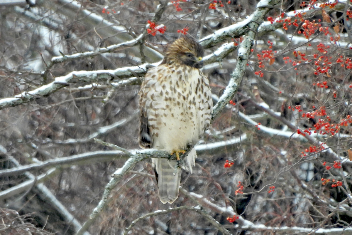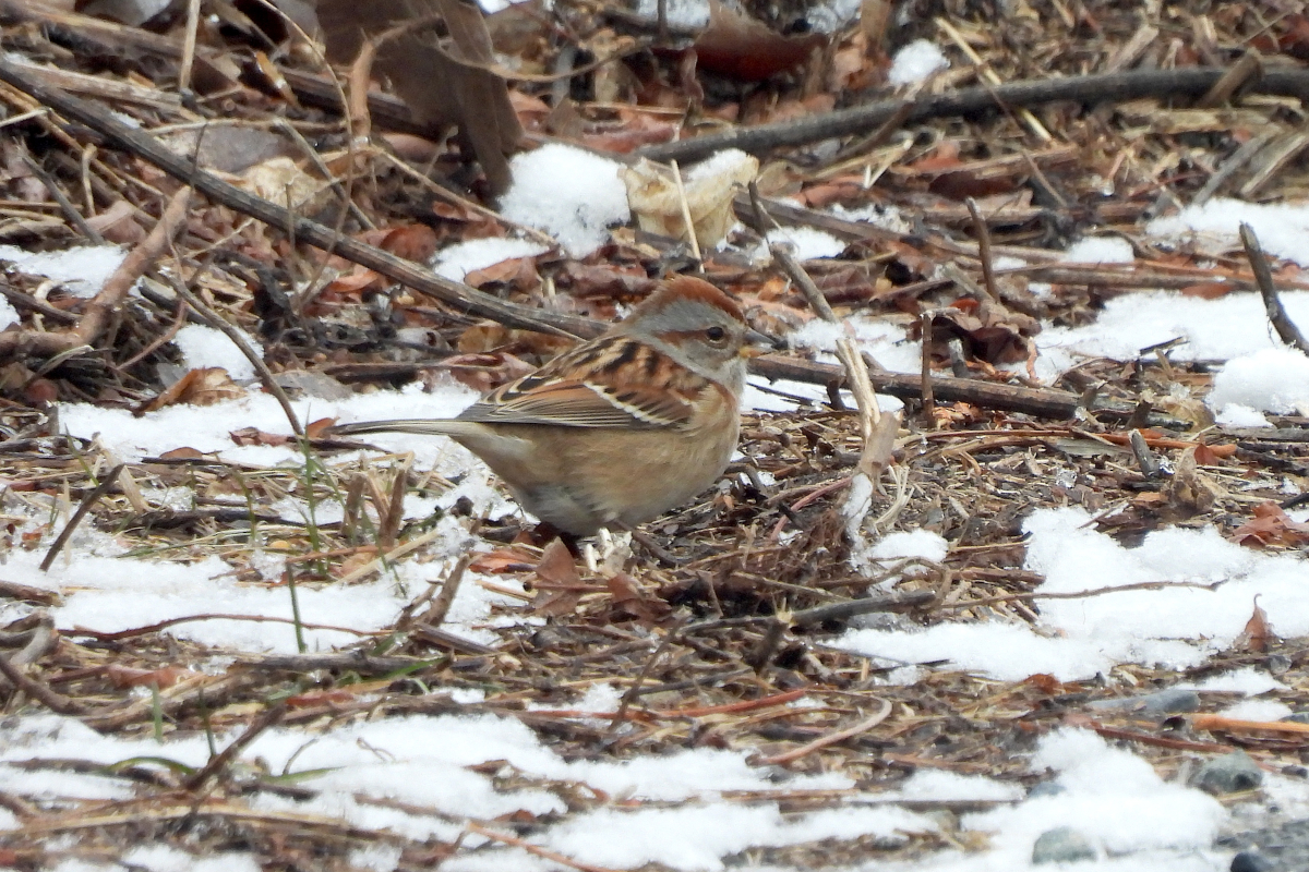 and other environments unique in New York county. On a crisp, clear morning after an overnight snow, a group of Linnaean birders led by Annie Barry traversed the island in search of winter avian residents including Red-breasted Mergansers and Buffleheads. We encountered the usual array of gulls along the harbor coast and as well as several large flocks of Brant and Canada Geese, albeit with no sign of hidden rarities. The piers on the south side of the island held several pleasant suprises for observers: a Great Cormorant taking flight from among its Double-crested cousins; an American Wigeon napping alongside American Black Ducks on Lima Pier; and a lone Lesser Scaup swimming around Yankee Pier. Although we did not discover any storm-tossed vagrants, we were treated to the memorable image of a dozen Song Sparrows and a Swamp Sparrow feeding and staying warm atop an Earth Matter NY (https://earthmatter.org/) compost heap from which plumes of water vapor were visible rising into the sub-freezing atmosphere.