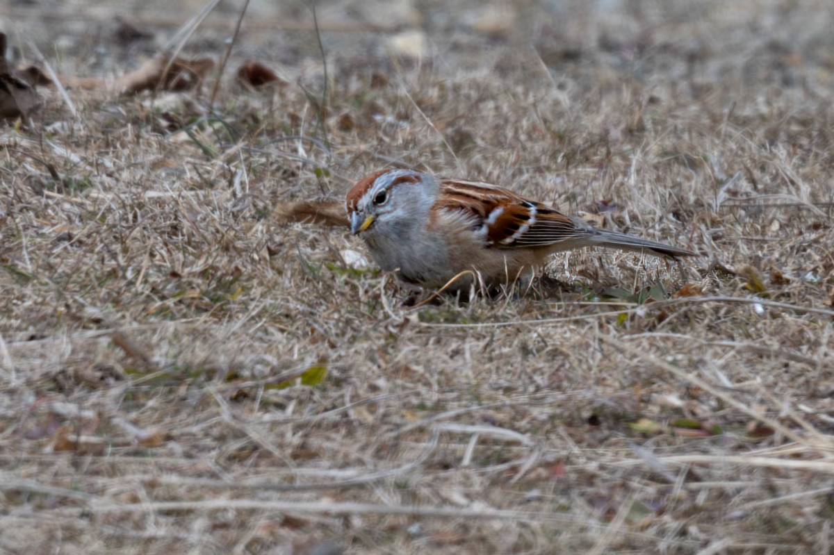 Walking back from the shore, we saw a young Red-tailed Hawk swooping as it practiced hunting. In the grassy field just before the parking lot, we were treated to the sight of a trio of American Tree Sparrows foraging in the grass – we were keeping our distance to avoid flushing the birds and from afar we thought they might be Chipping Sparrows but a sharp-eyed birder pointed out the bi-colored bill, and our identification of the Tree Sparrows was further cemented by photographs. This wrapped up our great morning of birding, lead by the wonderful Jack Rothman who generously shared his expertise and his know-how of the park.